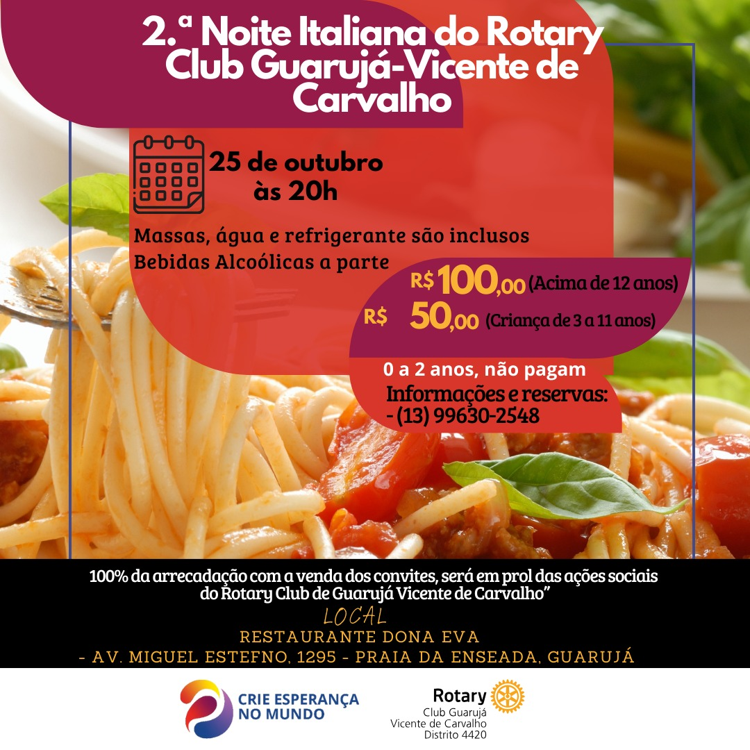O Rotary Club Guarujá - Vicente de Carvalho realizara no dia 25/10/2023 nossa 2ª Noite Italiana, que será realizado no Restaurante Dona Eva, localizado na Av. Miguel Estefno, 1295 - Praia da Enseada, Guarujá.