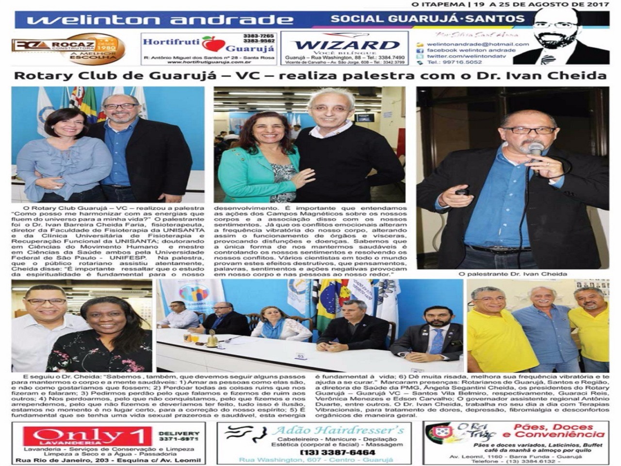Com data 14 de Agosto, o Professor Ivan B Cheida (Mestre em Ciências da Saúde) Professor e Diretor de Fisioterapia Unisanta, proferiu uma bela Palestra, tema Harmonização de Energia, saúde e prosperidade nas dependências do Club. Sendo muito aplaudido pela plateia, a nossa palestra foi abrilhantada com a presença de vários presidente da Baixada.