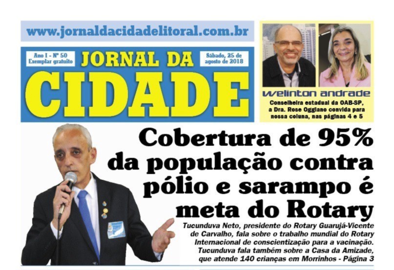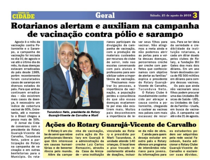 Presidente do Rc de Guarujá Vicente de Carvalho, Jose Tucunduva Neto fala sobre o trabalho mundial do Rotary Internacional da conscientização para a vacinação. Matéria publicada no Jornal da cidade, dia 25 de Agosto 2018.